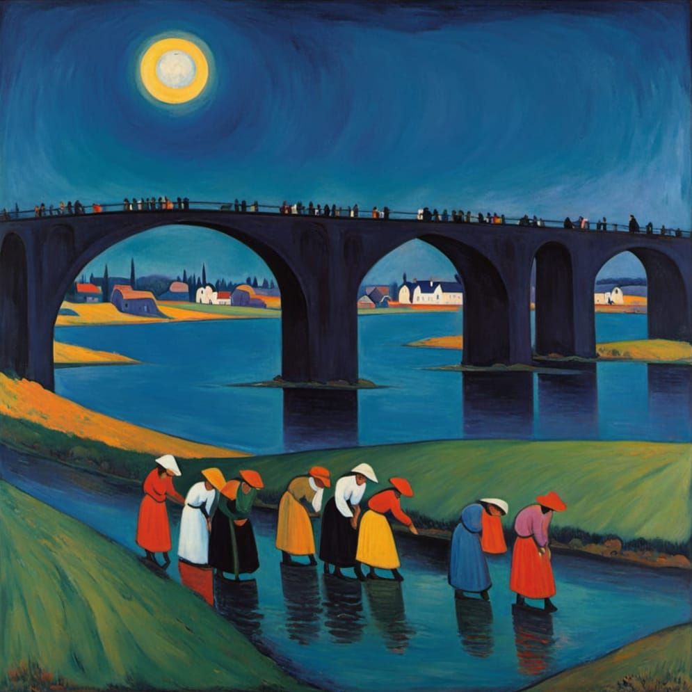 Washerwomen near a bridge by Marianne von Werefkin, expressionism, fluid, opaque tempera and stylistically follows the influence of the Nabis school, which followed in the footsteps of Paul Gauguin and achieved a synthesis of the image by dividing it into simple areas of colour and dark outlines.