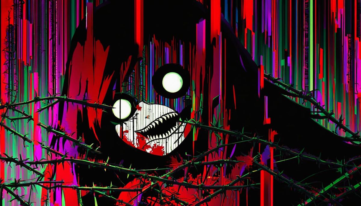 This image shows a laughing demon in a horrific scene with barbed wire and blood. Set in a creepy college, the manga-style art features glitching wire frames and dark shadows, creating a macabre atmosphere.