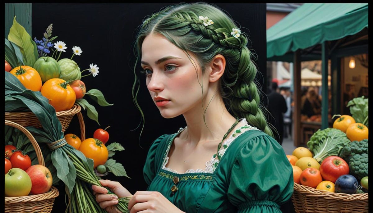 This striking image shows a cyberpunk woman with a french braid at a farmer's market, holding a wicker bag. It features deep warm and cool neon colors and clean lines, evoking a vibrant atmosphere.