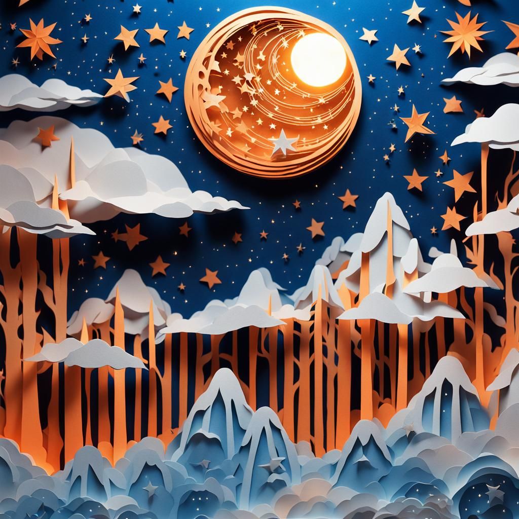 This image shows a 3D paper cutout of a moonlit starry sky suspended in mid-air. The macro photograph showcases rich fantasy concept art with glowing stars and vibrant blue and orange hues, rendered as photorealistic style.