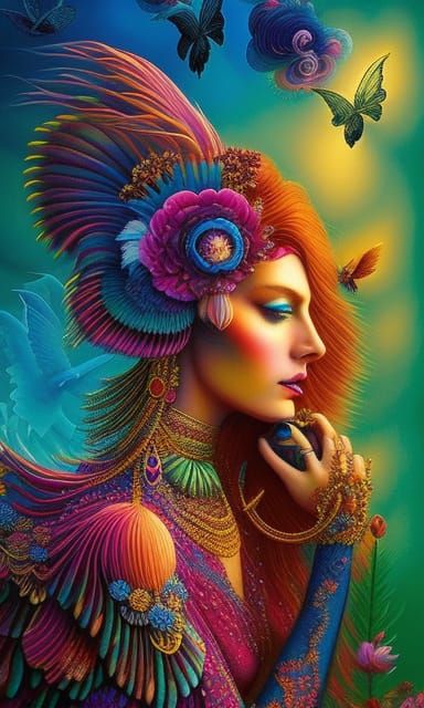 A vibrant image of a figure with a hallucinogenic mushroom, reminiscent of fashion magazine art. The piece features rich colors, intricate details, and a magical, dreamlike quality.