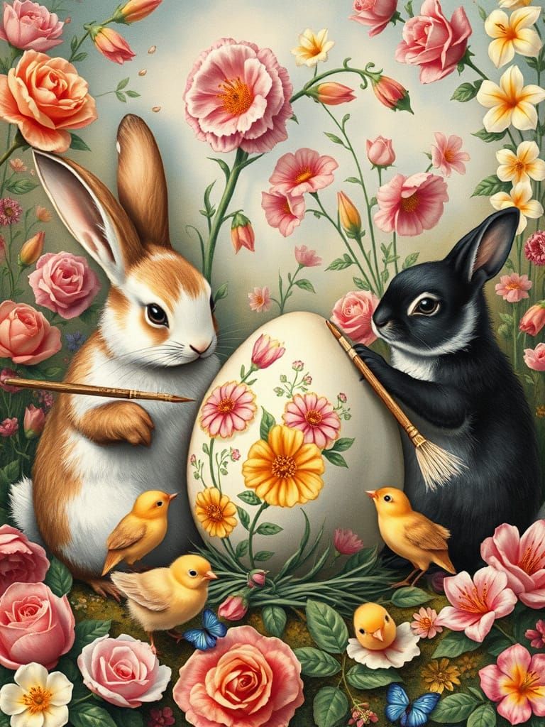 A vintage charcoal drawing of two bunnies and two chicks painting Easter eggs. The fairy tale landscape is filled with roses, lilies, and gladiolus in intense colors, with golden details, in Mucha style.