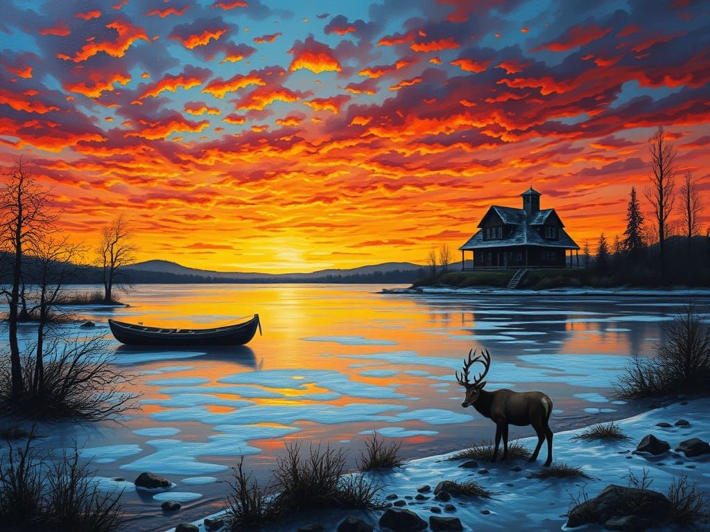 This encaustic painting depicts a vibrant sunset over a frozen lake, featuring a traditional Bulgarian house and an elk. The art uses a detailed, mysterious, and deep color palette.