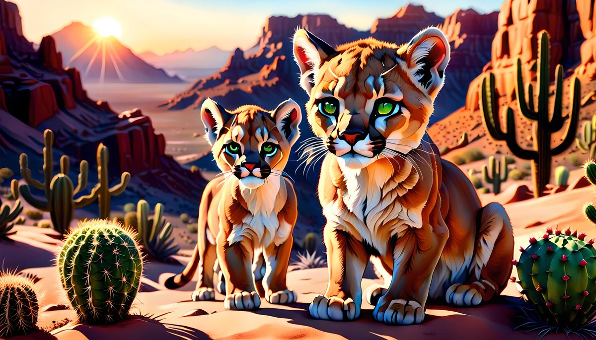 A vibrant image shows a fluffy baby puma in a desert canyon at sunset. The artwork features dynamic lighting and intricate details, reminiscent of splash art in a colourful, volumetric style.