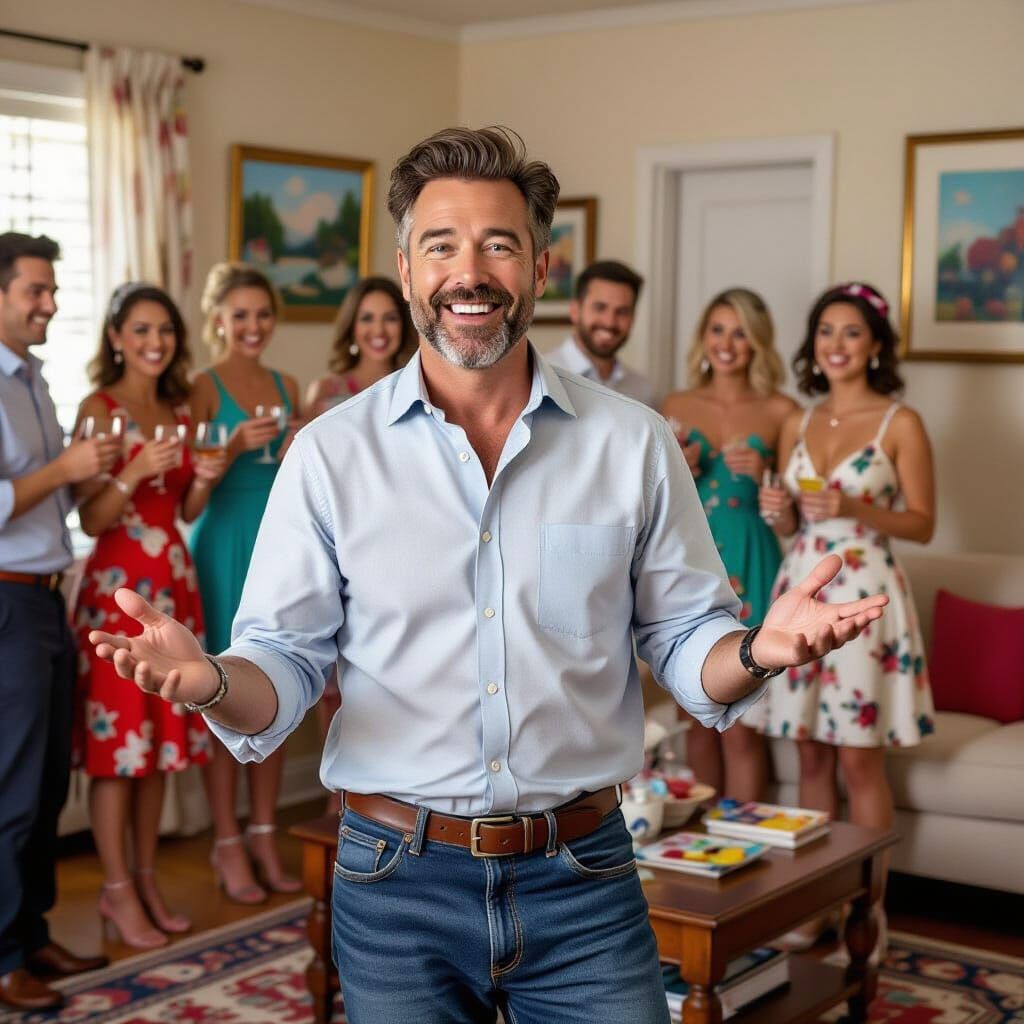 This image shows a party scene with guests in a living room. A man in casual attire jokingly encourages the guests to make a mess, reminiscent of vibrant and whimsical illustrations.