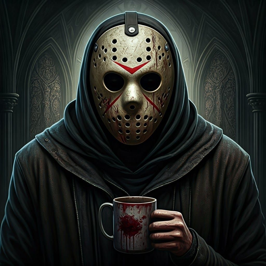 This image shows a figure in a hockey mask with mystical symbols and blood, holding a dirty mug. The backdrop features dark academia and gothic mosaics, creating an eerie and mysterious concept art piece.