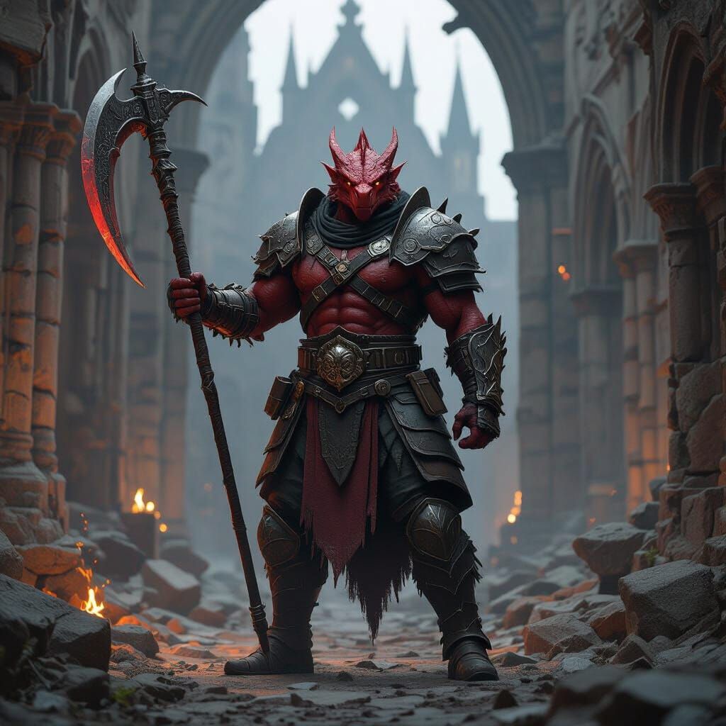 This image depicts a red dragonborn barbarian warrior wielding a glaive amidst the Gothic ruins of Drakkenheim. Rendered in a detailed matte painting style with rich colors, it showcases high-resolution fantasy concept art.