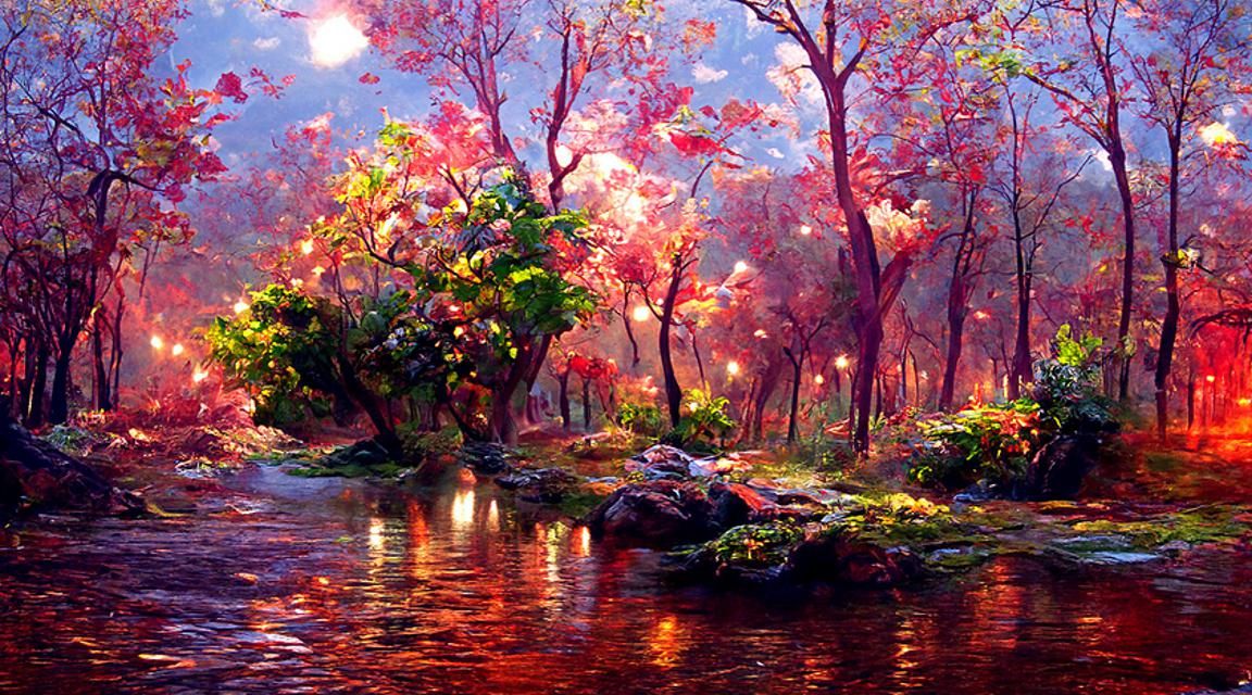 Beautiful pink trees, pink leaves, iridescent opalescent reflections, glowing Moon, soft brush strokes, Romanticism