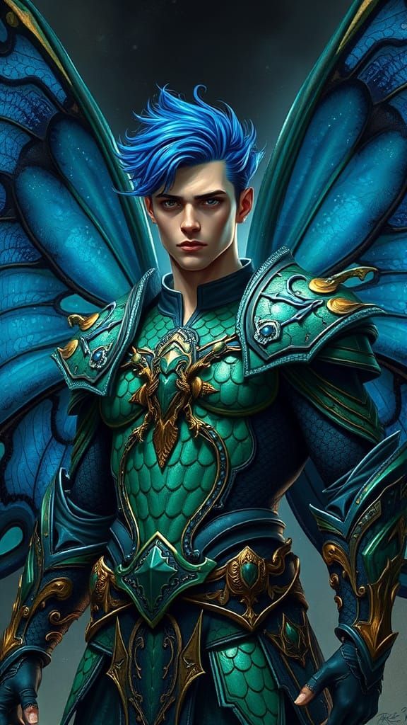 Masculine blue-haired male fairy knight in ornate green scale armor, adorned with intricate bronze accents, huge midnight blue butterfly wings spread wide, exuding intimidation, in a dramatic, fantastical scene, in a style reminiscent of Frank Frazetta's dramatic lighting, Simon Stalenhag's atmospheric ...