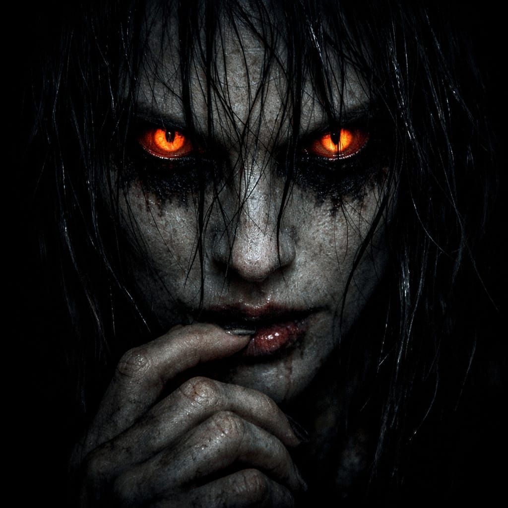 This hyper-realistic image features a chilling portrait of a supernatural being with intense, glowing amber eyes and pale, textured skin emerging from darkness. The dramatic lighting emphasizes its menacing appearance.
