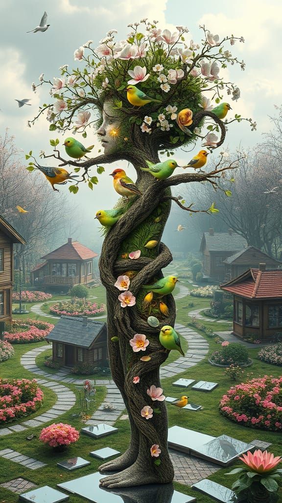 This image shows a serene and dreamlike scene of a woman's body transformed into a blooming tree, surrounded by a peaceful village and gardens, with intricate details and miniature glowing creatures inhabiting her form.