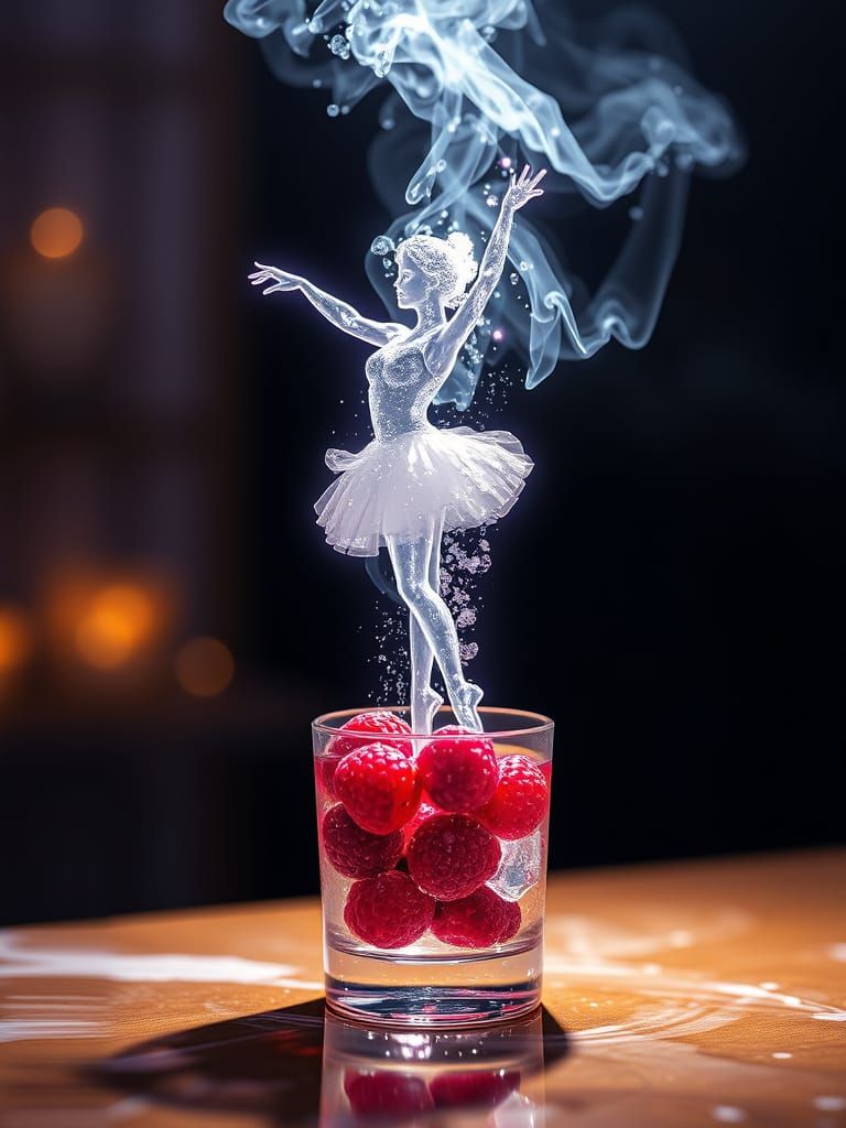 In painting, double exposure, Transparent silhouette visible transparent water ballerina made from ice cube sticking out he body from the a glass of sparkling berry with smoke, dripping water, flowing bubble inside a surface of glass on table, with glowing gesture movement line of silhouette, ...