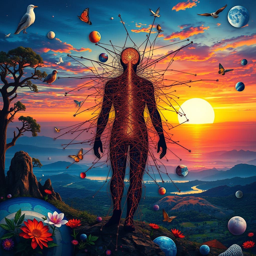 A breathtaking digital artwork featuring a glowing human form against a vibrant sunset, symbolizing strength and resilience, amidst intricate textures and abstract designs, inviting the viewer to find inner peace.