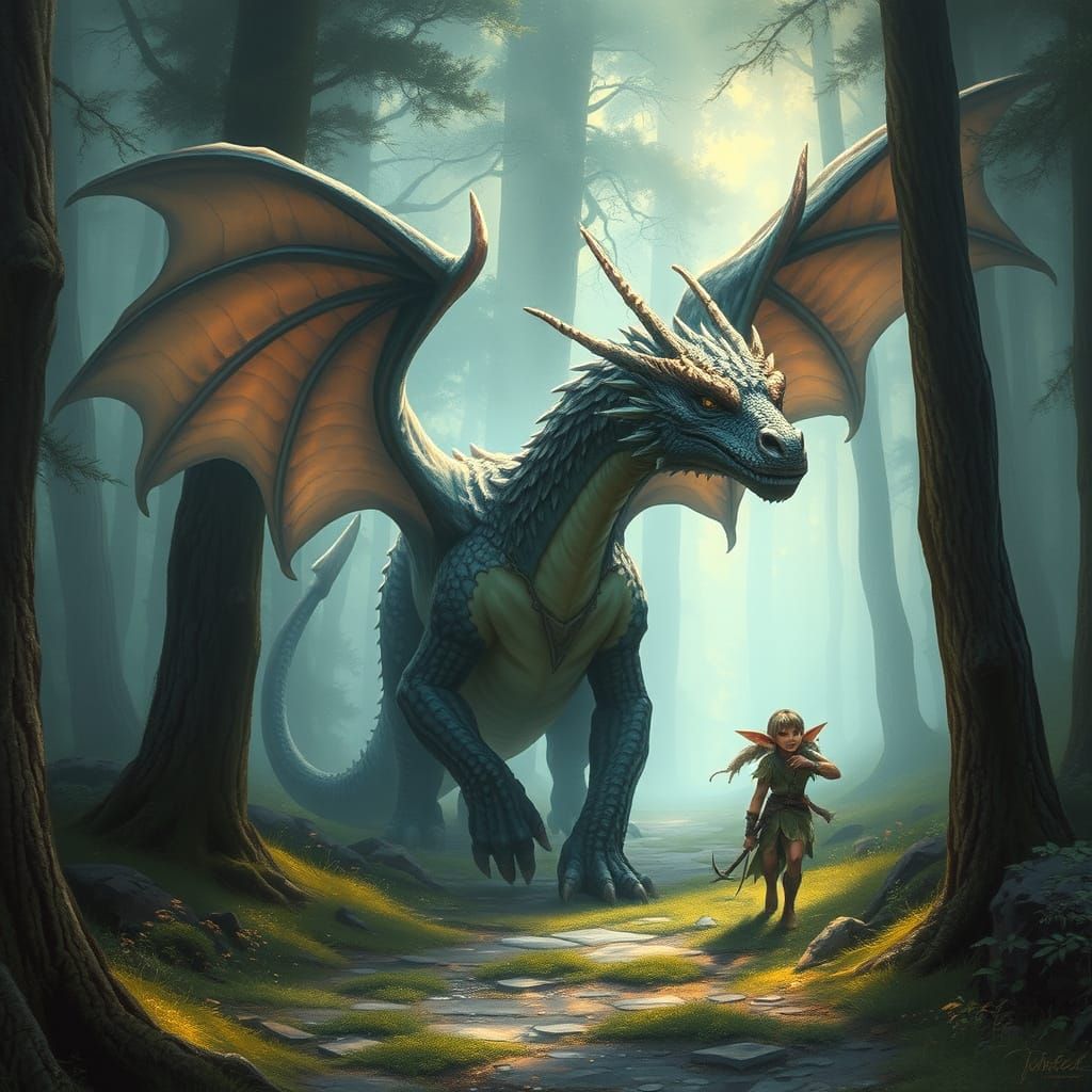 A serene image of a dragon and elf strolling through a mystical forest, surrounded by ethereal mist, reminiscent of Thomas Kinkade's style