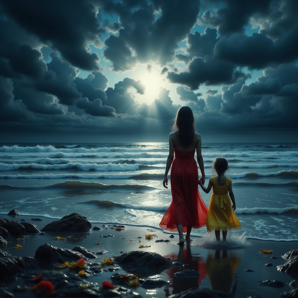 A poignant image showing a woman and child in complementary colors, seemingly dissolving to represent the fleeting nature of time. Created with mixed media techniques.