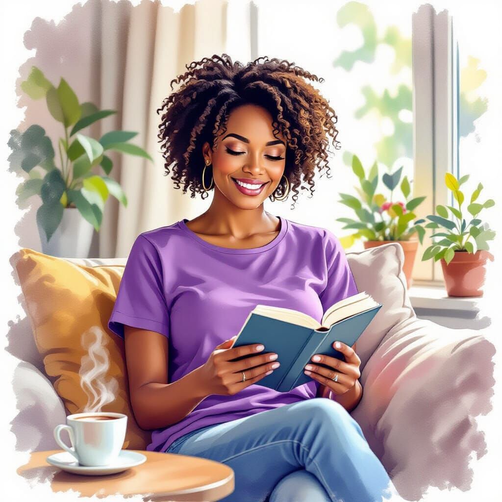 This image shows a cheerful African American woman reading a book on a sofa in a sunlit conservatory. The digital art has a watercolor sketch aesthetic with pastel colors.