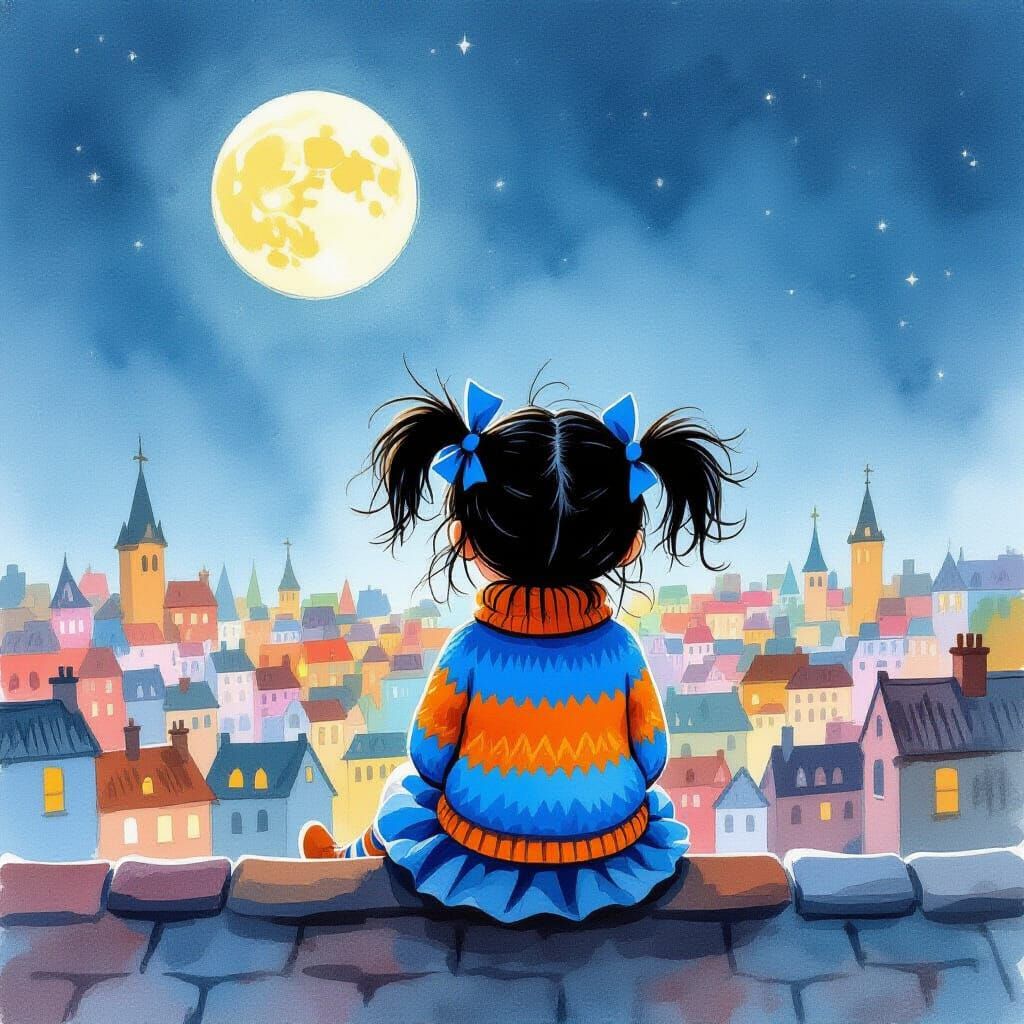 This image shows a child with messy pigtails and blue bows, wearing a colorful sweater, sitting on a rooftop and looking at the moon over a cityscape. Rendered in a vibrant watercolor cartoon style with expressive brushstrokes.