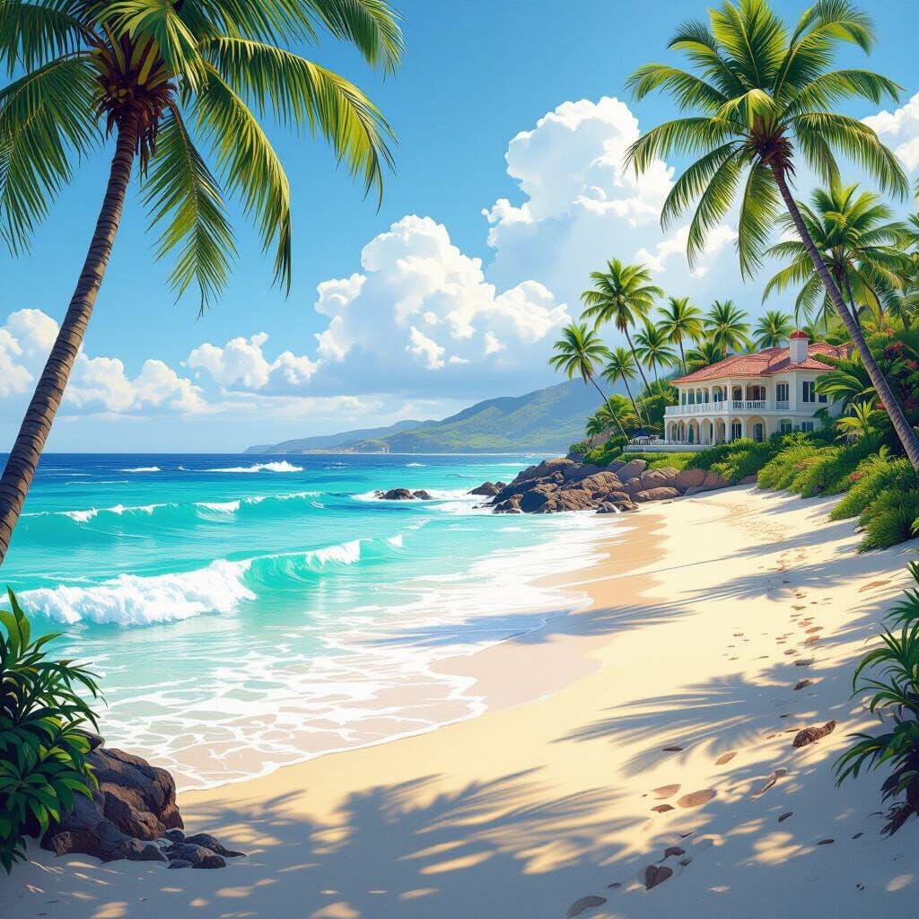 This image depicts a serene beachfront paradise. Crystal-clear turquoise waves meet sun-kissed sand, with palm trees and an elegant home. Created with vibrant colors and dynamic lighting, it evokes oceanfront tranquility.