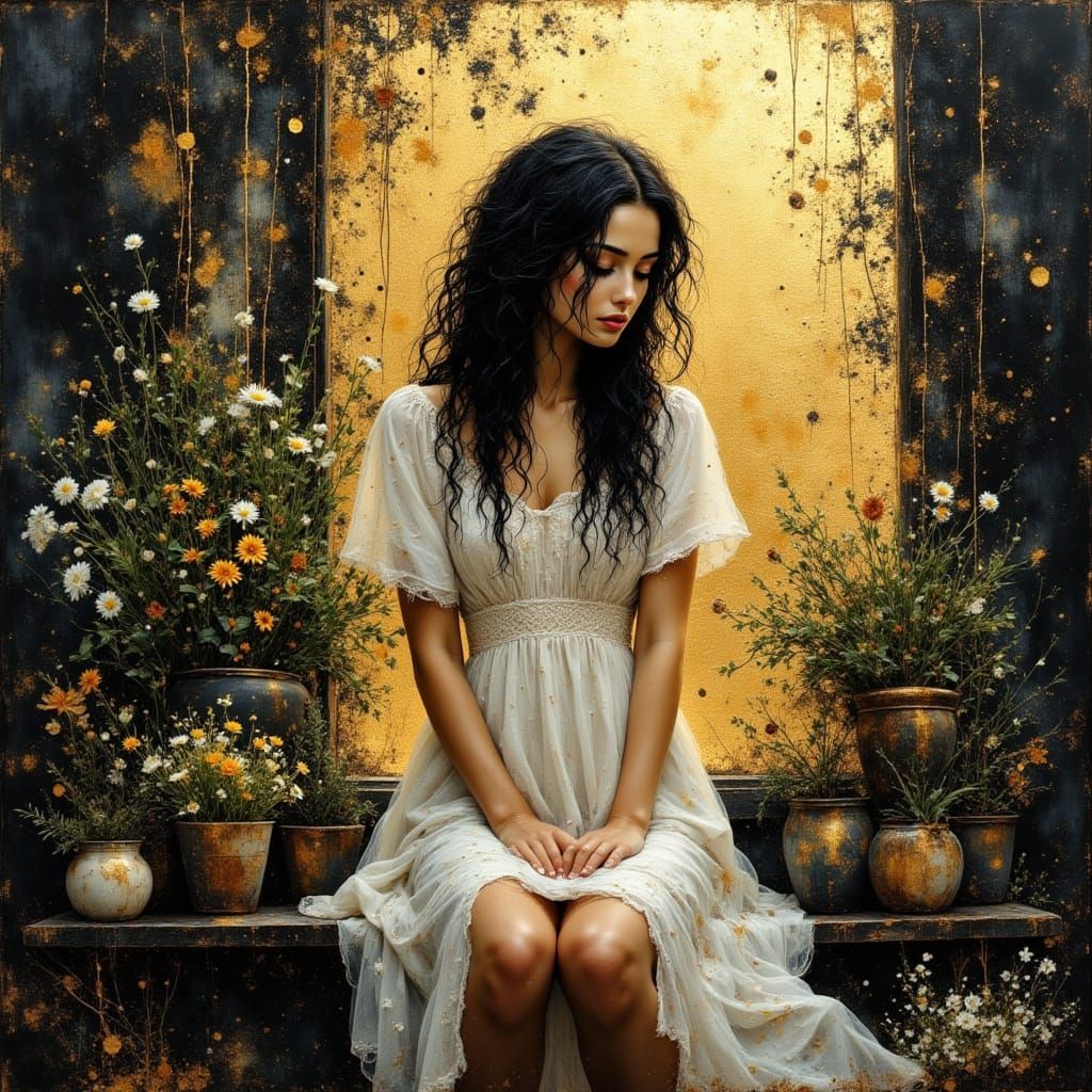 This image shows a beautiful young lady with dark curly hair, wearing a white dress, sitting sadly on a bench. It features burnished gold ink and watercolor textures on a black canvas, creating a dreamlike aesthetic.