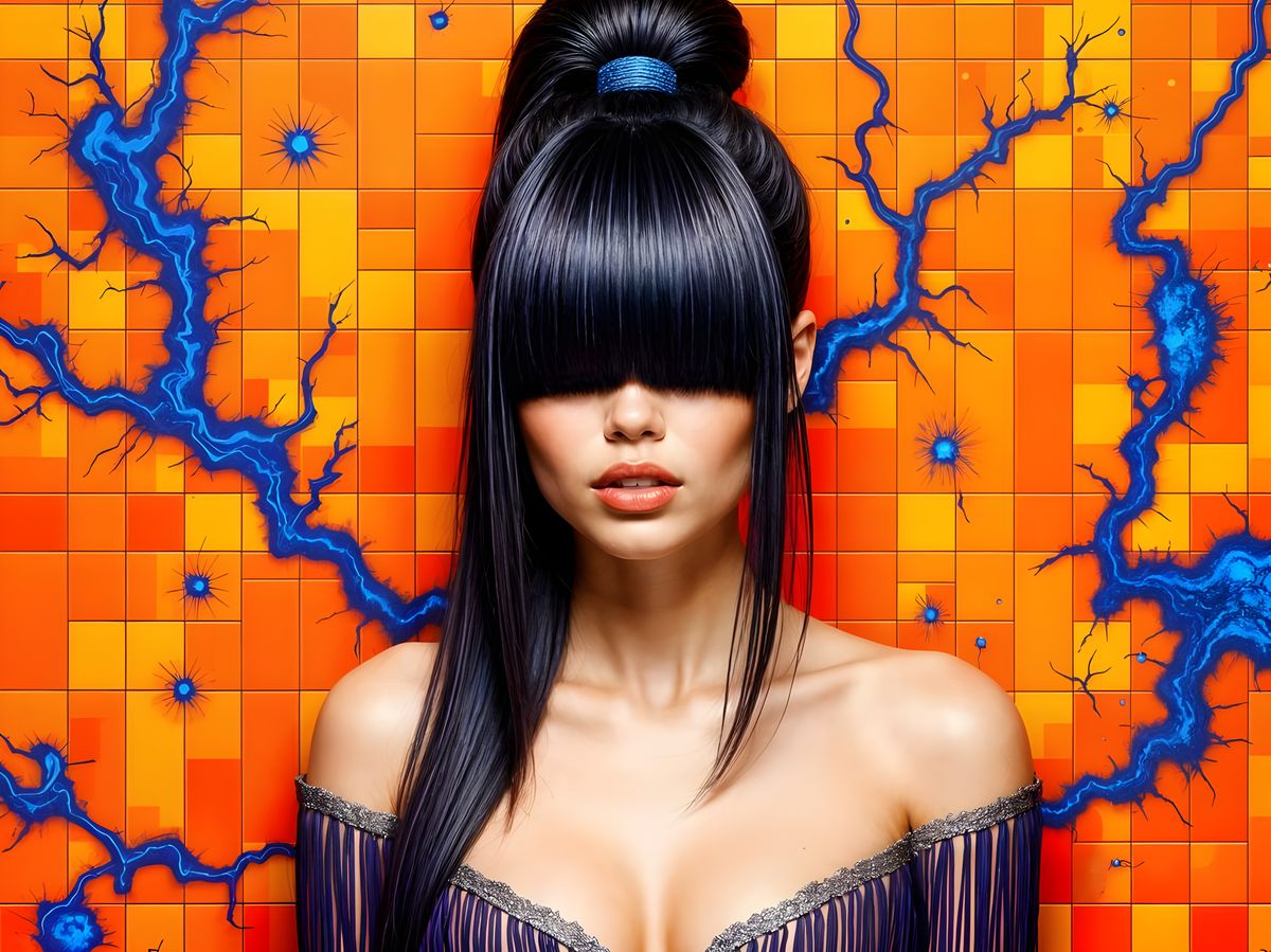 A vibrant image of a woman with striking blunt bangs and a high ponytail, set against a backdrop of electric orange and blue lightning. The image has a bold, modern aesthetic.
