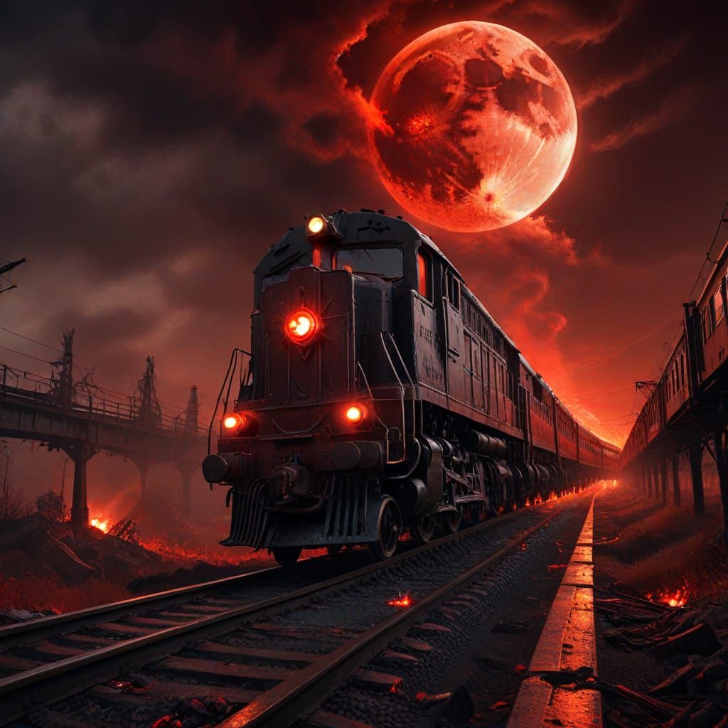 This image shows a death train on a railway to Hell beneath a blood moon. Ominous lighting and glowing embers create an eerie atmosphere. The scene is rendered with vivid textures and bold brushstrokes in a dark fantasy style.