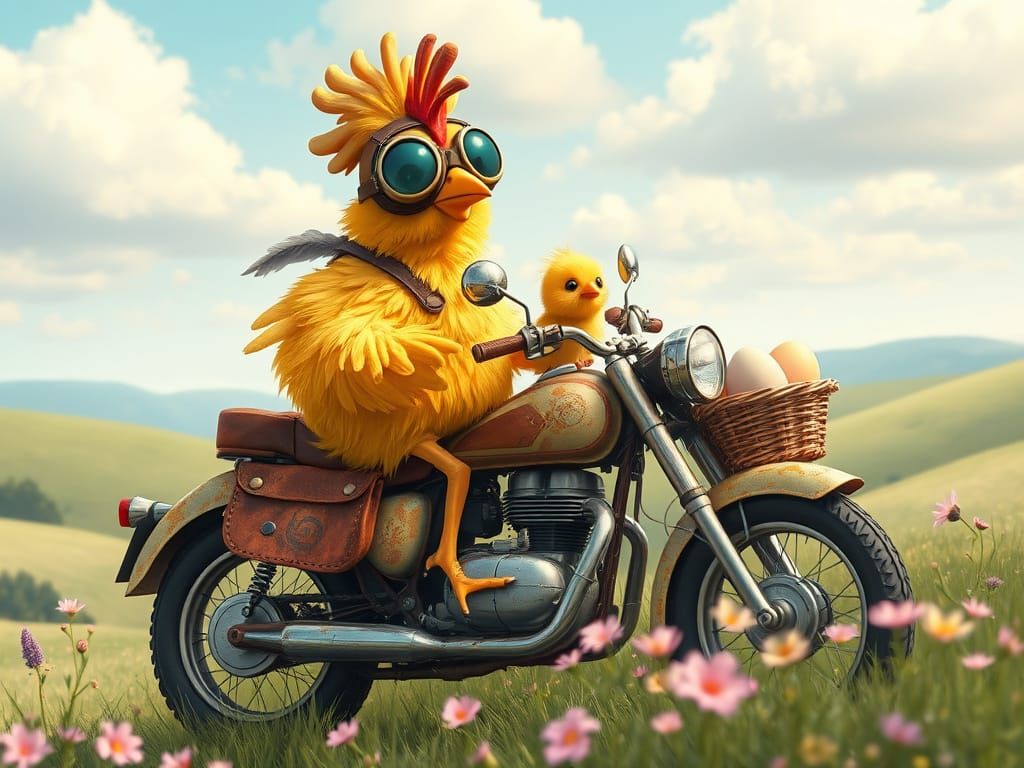 This image depicts a playful, fluffy yellow chicken wearing an aviator helmet, riding a distressed vintage motorbike with colorful patterns, through a dreamlike hilly landscape. A sidecar holds pastel eggs and a small chick, set against a soft blue sky with puffy clouds and blooming wildflowers.