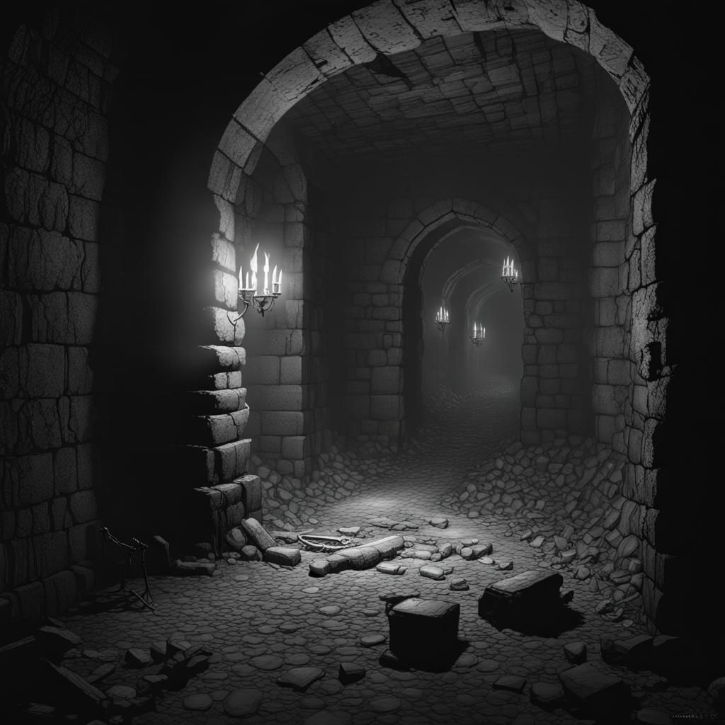 A black and white drawing of a dark, intricate dungeon corridor with stone block walls, torch light, debris, dirt, and bones. The artwork is reminiscent of dark fantasy concept art.