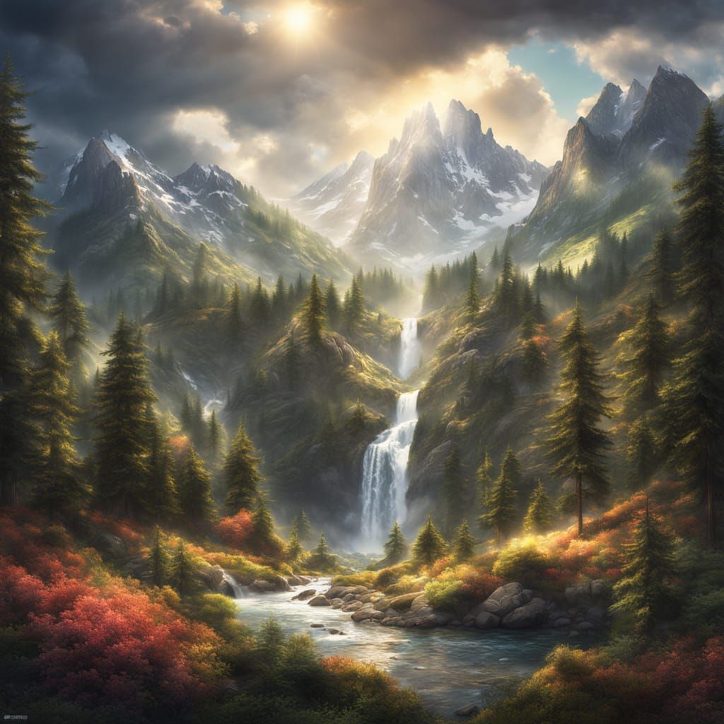 A digital matte painting of a mountain landscape featuring a waterfall and pine trees. This hyperrealistic image displays dramatic side lighting and a colorful background with heavenly sunshine beams.