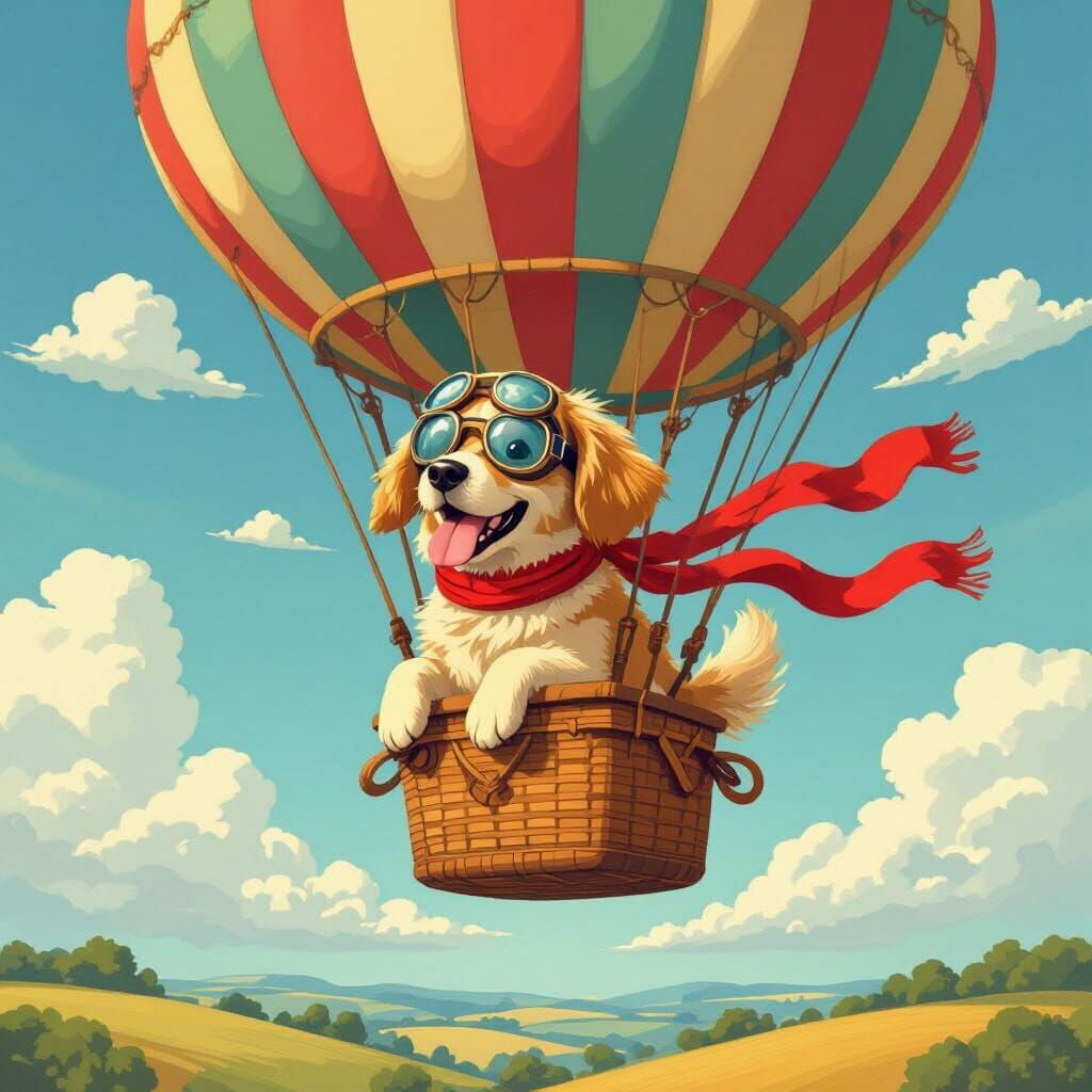 This image shows a golden retriever wearing pilot goggles and a red scarf, flying a hot air balloon over a countryside landscape. The artwork is reminiscent of classic children's book illustrations.