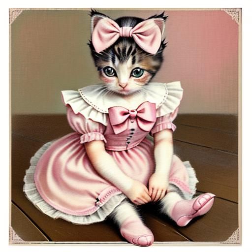This image shows a kitten wearing a pink bow, depicted in a vintage art style reminiscent of an old greeting card. It is a charming and nostalgic scene.