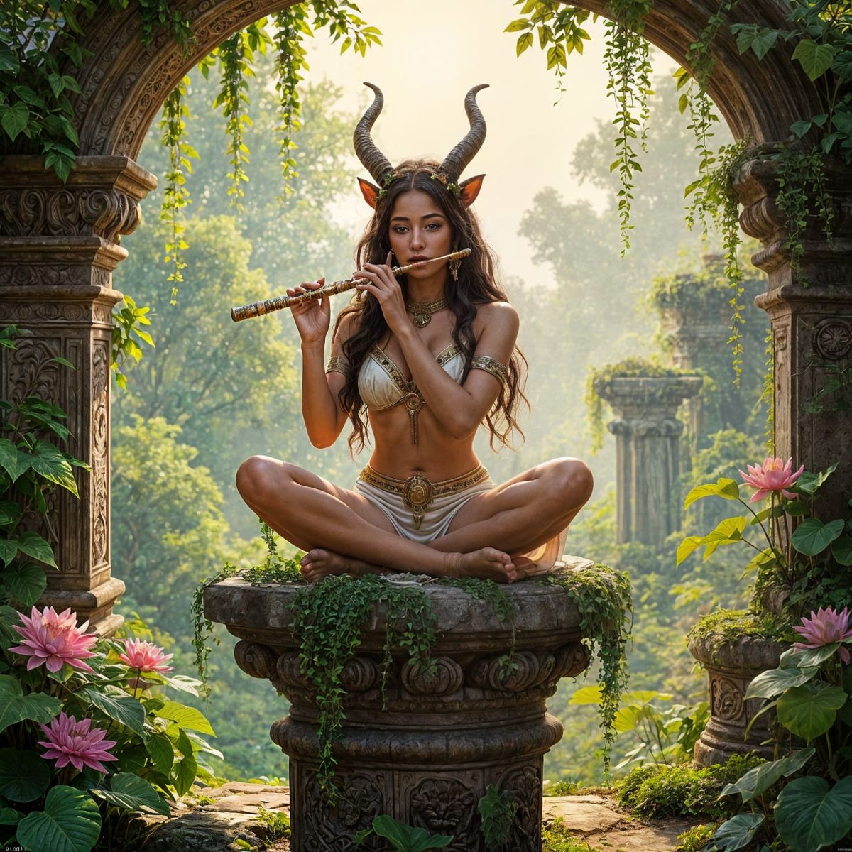 This hyperrealistic image showcases a beautiful faun woman meditating on an ancient pillar, playing a flute amidst a colorful, detailed Arcadian landscape with intricate details.