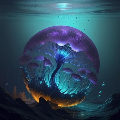 A striking picture of space jellyfish floating in a pond with fish, stars, and a black hole. This digital art features deep blues and purples, gold accents, and soft bioluminescence. The image blends luxury with a science fiction aesthetic.