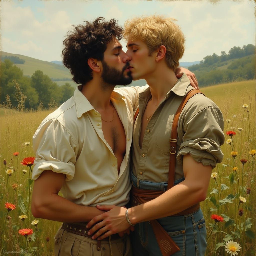 A tender image of two young men embracing in a sun-drenched English countryside. The artwork features early 20th-century romanticism with soft golden lighting and earthy tones.