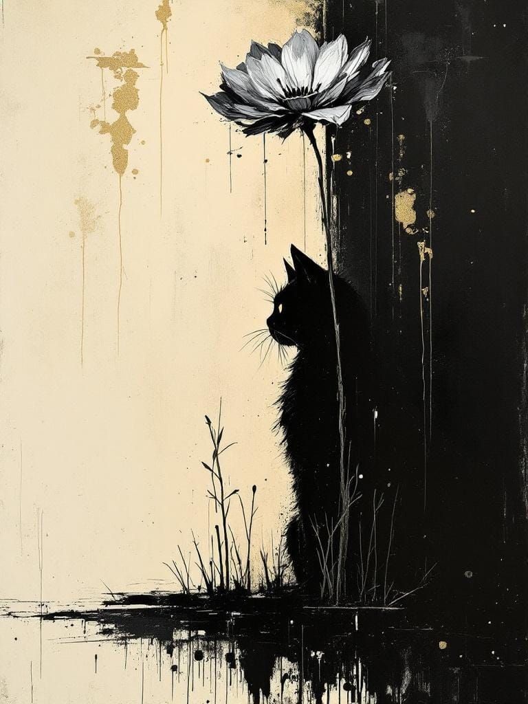 This image shows a cat beneath a flower in a split background. It features bold gestural strokes with distressed surface textures, creating a weathered and high-contrast cinematic atmosphere.