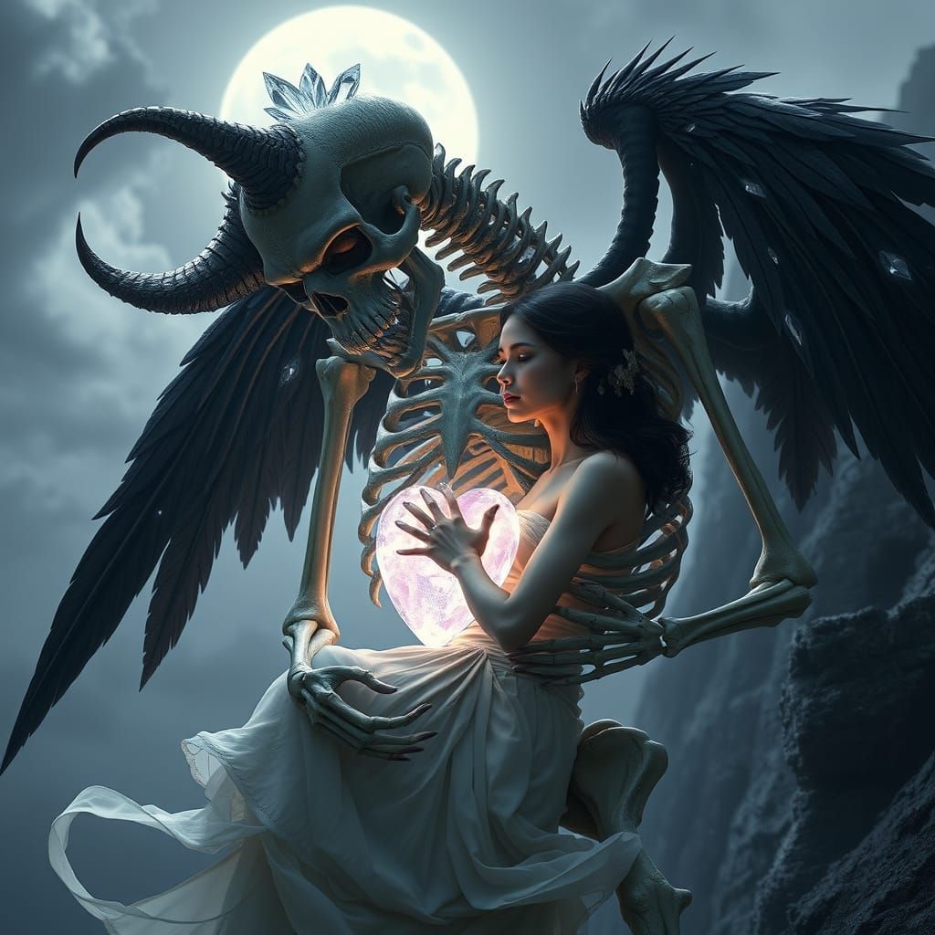 A striking picture of a skeletal figure with horns embracing a woman. Ethereal wings and a crystallized heart add to the surreal scene in a gothic, dreamlike setting. A cinematic fantasy art piece.