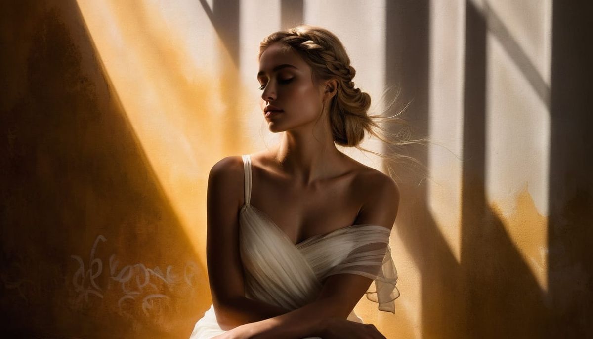 A captivating image of a fair-skinned woman in a seated pose. She wears sheer organza, and her blonde hair is in a braid. Soft lighting and graffiti art add depth in this baroque-style portrait.
