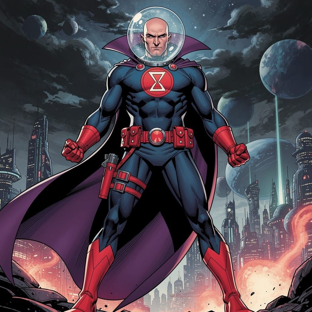 This image shows a superhero character in a comic book art style, featuring bold lines and dynamic lighting. The figure wears a unique sci-fi helmet and cape, striking a powerful pose.