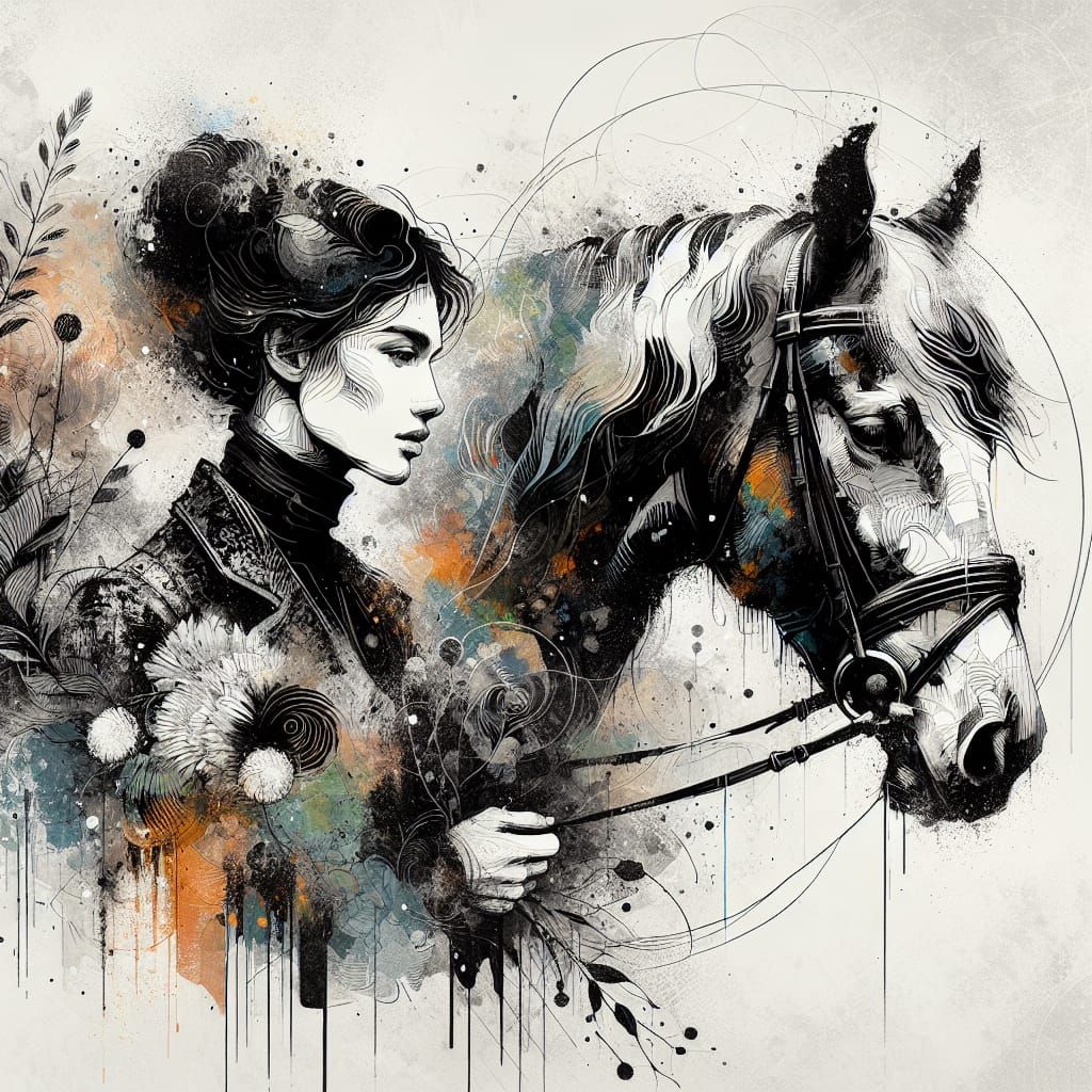 This image shows a high-resolution portrait of a woman and a horse. The artwork evokes an elegiac atmosphere with intricate details and oil-like splashes, reminiscent of pre-1912 art, using black line art and paint strokes.