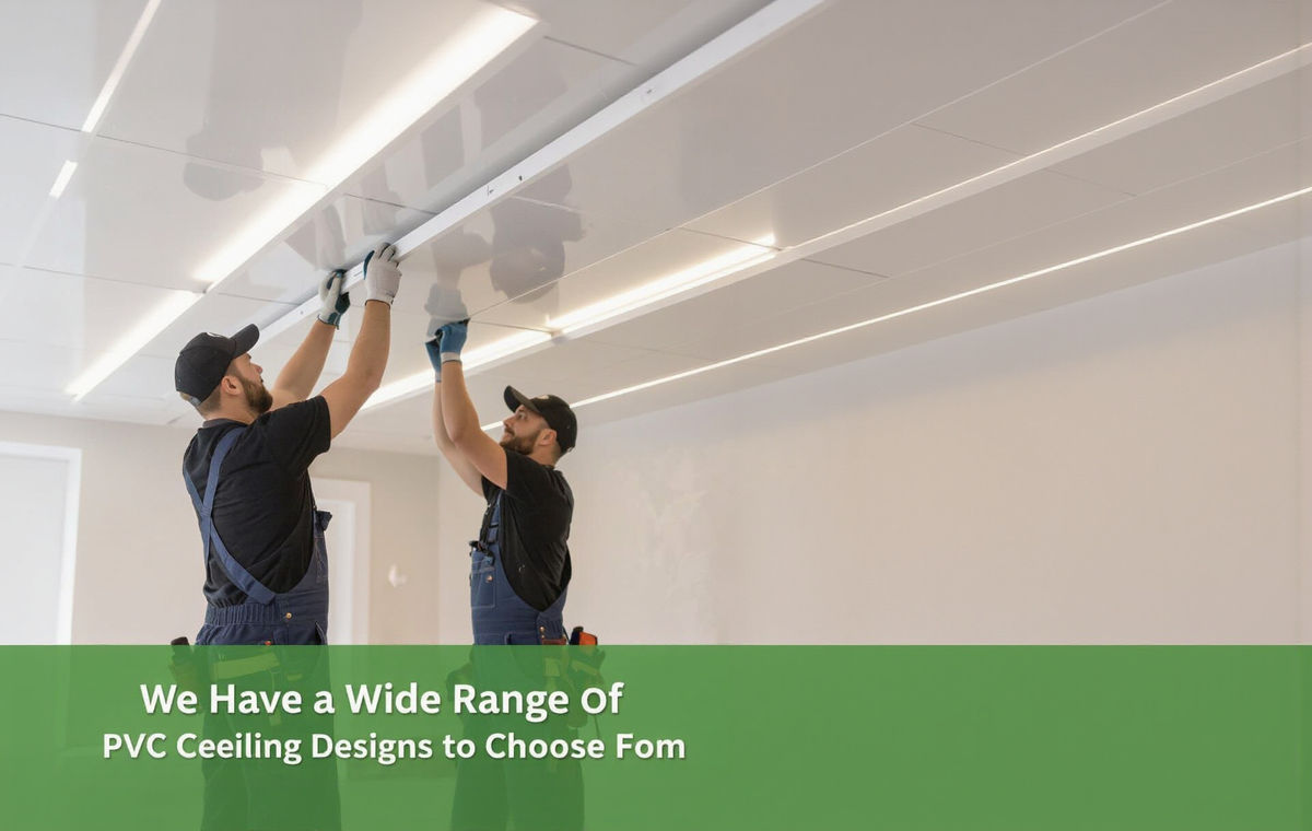 This image depicts two men installing long PVC ceiling panels in a home interior. A banner at the bottom advertises a wide selection of PVC ceiling designs.