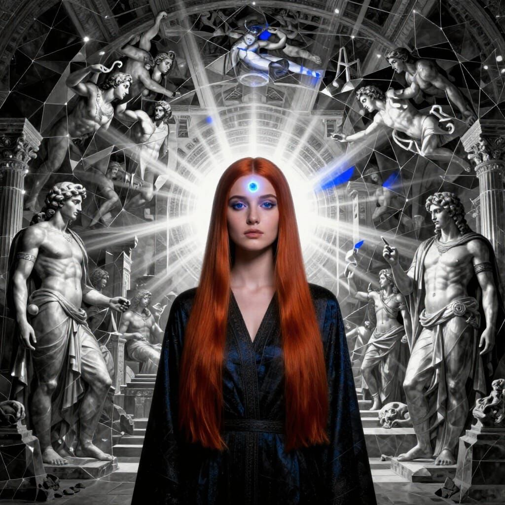 astonishing armenian girl wih ultra straight hairs, in vitruvian crystal mozaic vertex tablet , michelangelo guys around, in the epic ruin of city of shamballah in background with third eye, ray of lights between characters, ultra deep contrast, dramatic painting scene, almost monochromatic b&w and blue ...