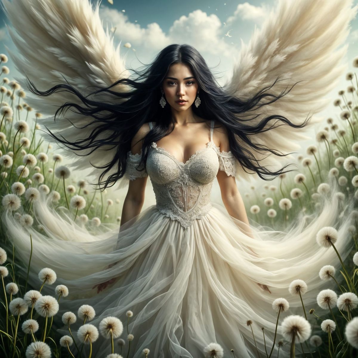 A stunning image of a windswept angel with flowing black hair, set against a vibrant and balanced background of swirling dandelions, captured in a cinematic film still with film grain and vignette effects.