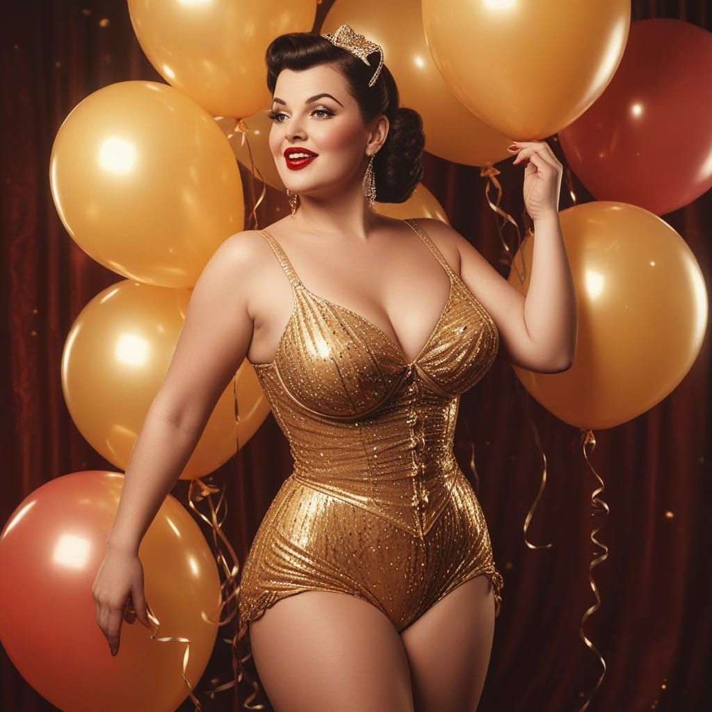 This image shows a plus-sized woman in a burlesque costume dancing with balloons. The retro illustration style evokes classic Hollywood glamour with a warm golden color scheme.
