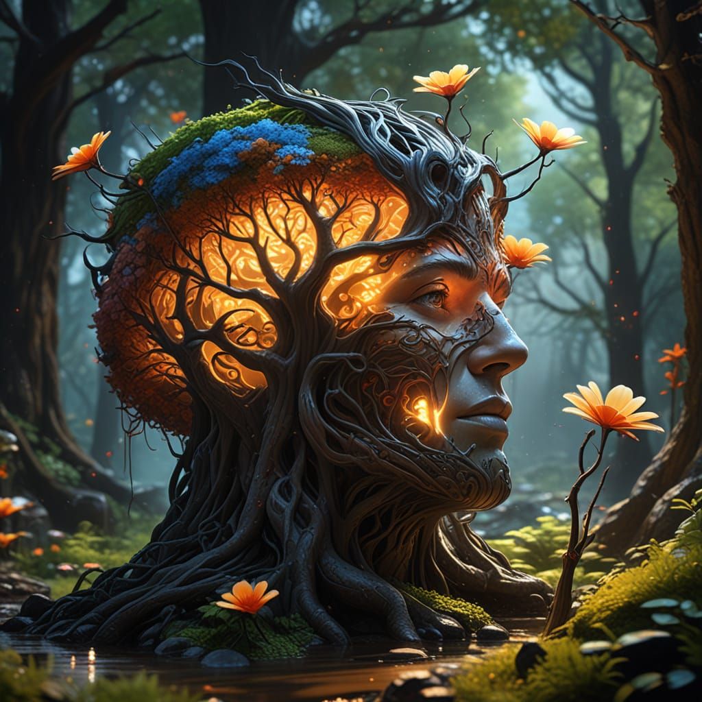 This surreal pop art image features a glowing tree with intricate details and vibrant colors, set against a mystical forest backdrop with soft focus and dynamic brushstrokes.