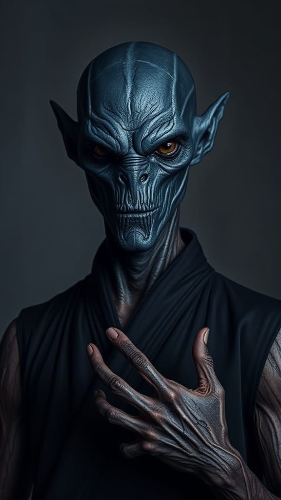 A striking picture of a mouthless, dark-skinned humanoid with webbed fingers, wearing a black gi. This portrait features high-contrast lighting and intricate textures, rendered in a photorealistic style.