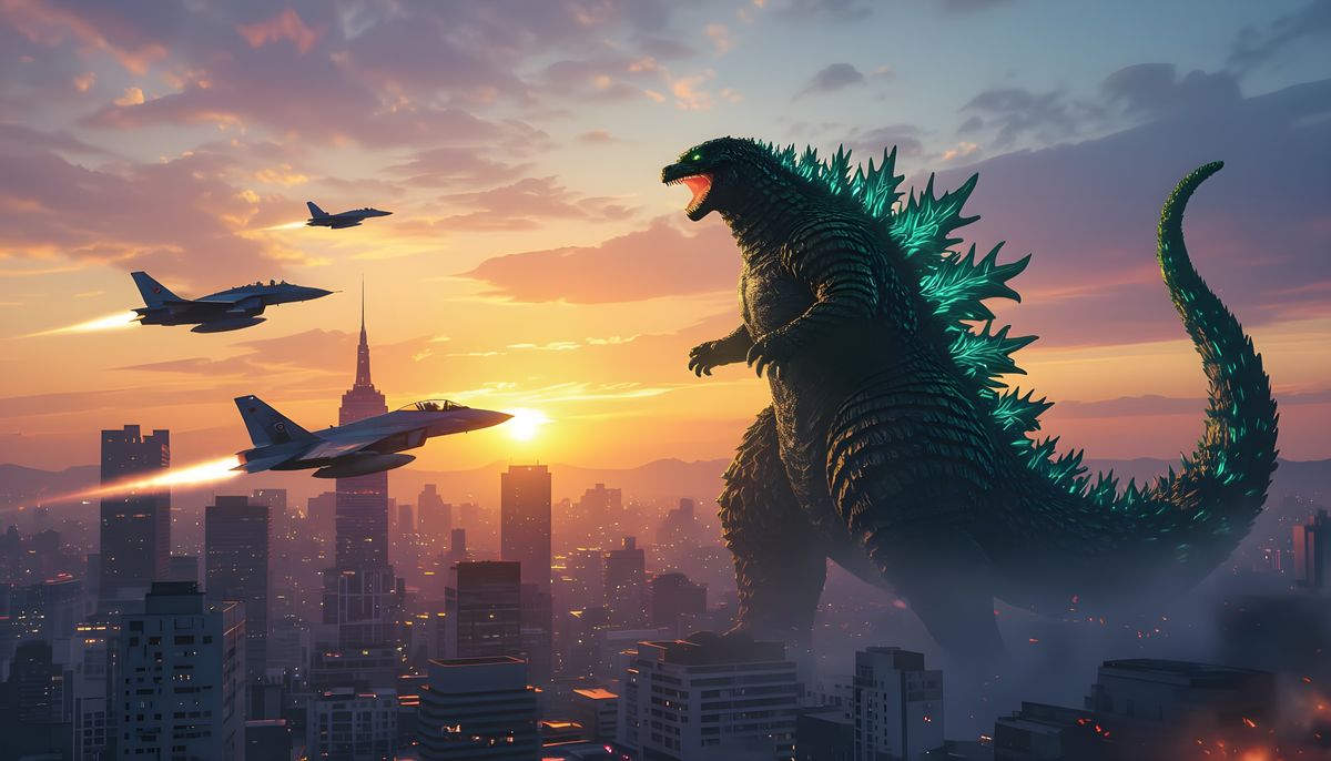This epic cinematic concept art depicts a massive green reptile monster looming over a toy-like city skyline during a dramatic sunset. Jets engage the creature in an intense battle.