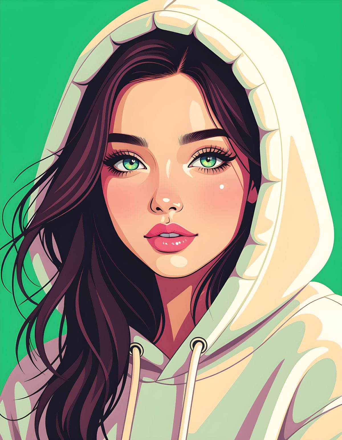 This image shows a beautiful girl with bright eyes and pink lips, wearing a pastel hoodie against a green backdrop. The digital art style blends cinematic lighting with dreamy textures and vibrant colors.