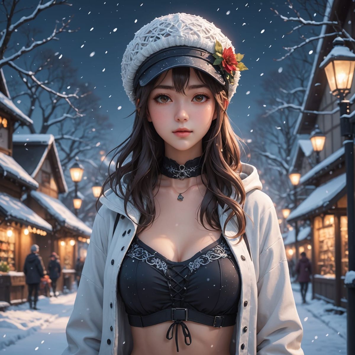 This image features a 21-year-old woman in a romantic winter bikini and hat, rendered in a detailed anime art style. It showcases breathtaking 8k resolution with ultrafine detail.