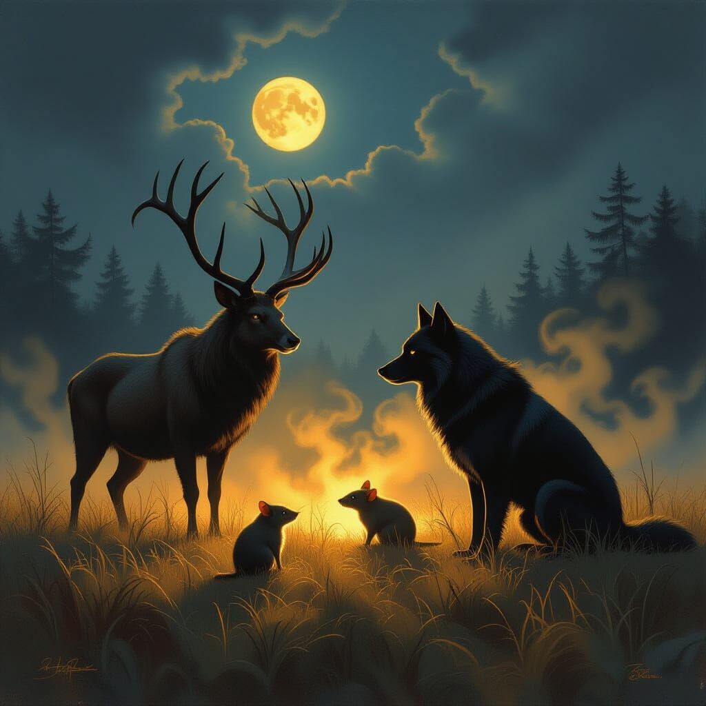 This image depicts a stag, werewolf, black dog, and rat in a foggy field at night. Warm light creates dramatic shadows in this oil painting.
