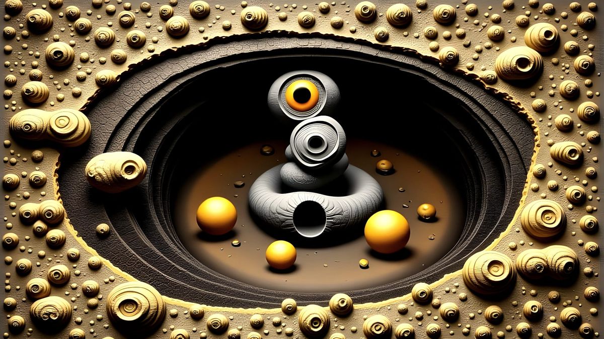 This image features abstract, textured layers created with advanced 3D rendering techniques. It evokes a sense of depth and complexity in a unique digital art style.
