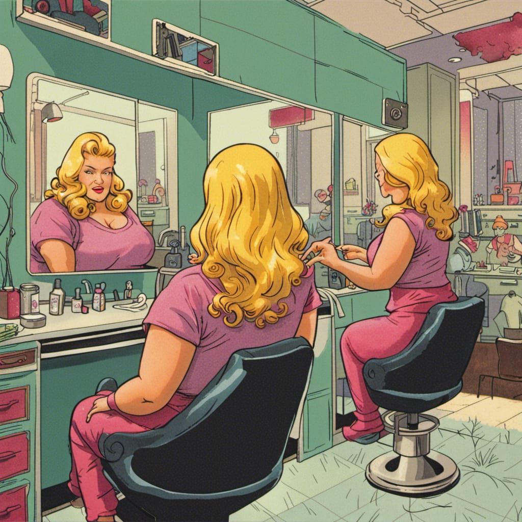 This image shows a plus-size blonde woman in a beauty parlor on Mars, admiring her new hairdo. Art Deco skyscrapers, moons, and rocketships fill the Martian cityscape outside, rendered as detailed matte painting.